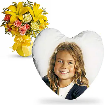 Cuscino Cuore 38x41cm con foto personalizzata abbinato ad un Mazzo di Rose gialle-arancio e Lilium gialli insieme ad altri fiori dai toni caldi e solari, contornato da verde di stagione elegantemente confezionato con carta o rete legata da fiocco o nastro. Inviaci la tua foto!