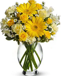 Delicato bouquet composto da rose gialle e bianche, gerbere gialle e vari fiorellini misti bianchi. Per un evento semplice e importante. Vaso non incluso.